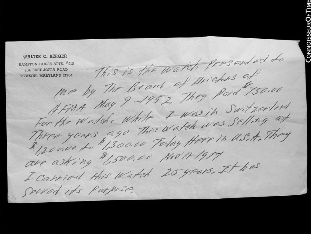 We believe this is a one-owner watch. The owner received it in 1952 for loyal service. With the watch we received an envelope with a handwritten note from the owner detailing its history and his 25 years of ownership to that point.