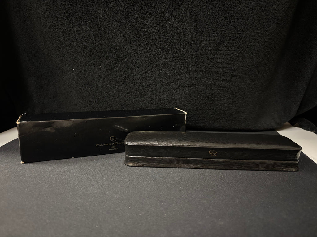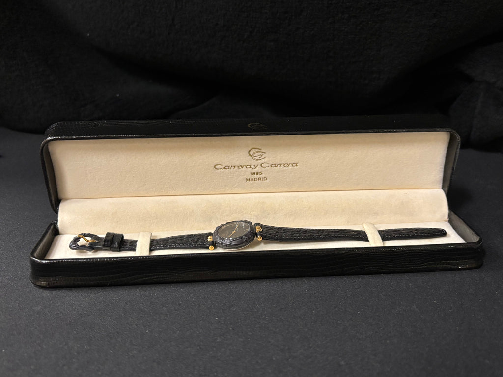Dial: Gloss black, signed Carrera y Carrera, gold applied pyramidal markers, mint condition