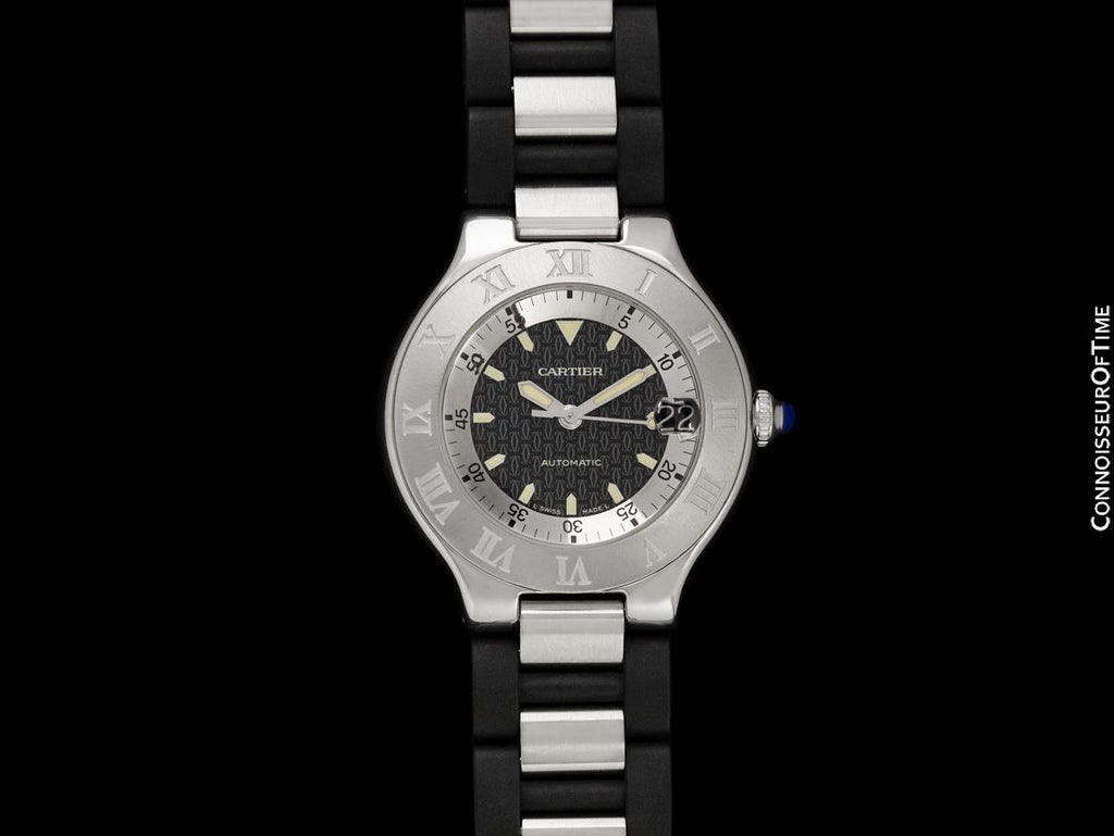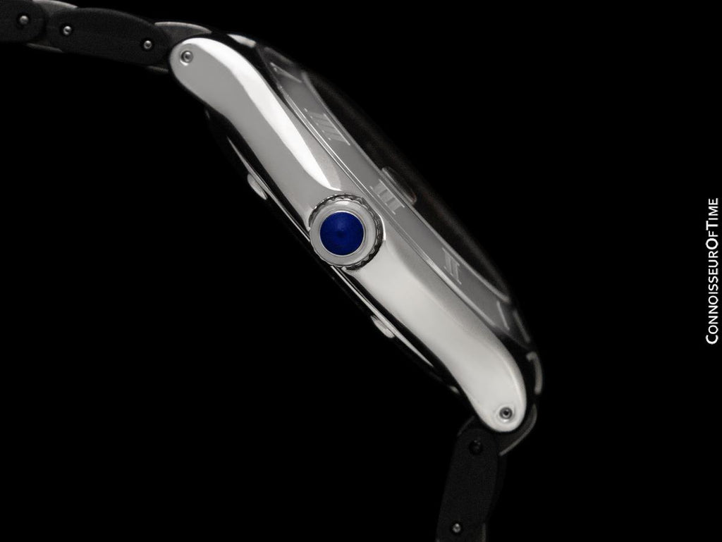 Unlike similar Cartier watches in this line, this watch is powered by a mechanical automatic Cartier movement. Because of the extra care and craftsmanship that goes into the Swiss made movement, Cartier wristwatches with mechanical mechanisms are considered more desirable than their quartz counterparts.