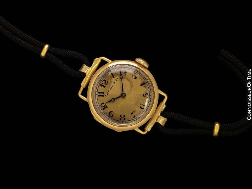 The round case radiates warmth in gold and measures approximately 24 mm across, a balanced and graceful size for the era. Its champagne-toned dial has a lovely Art Deco design, and the Tiffany & Co. signature affirms its exclusive provenance.