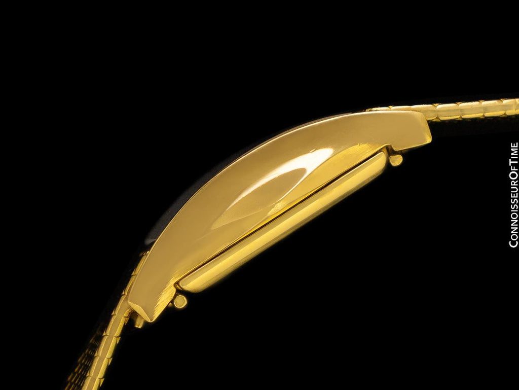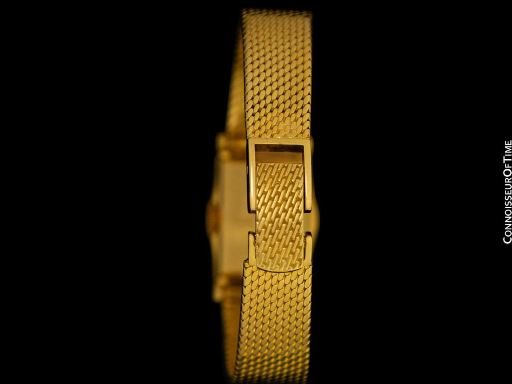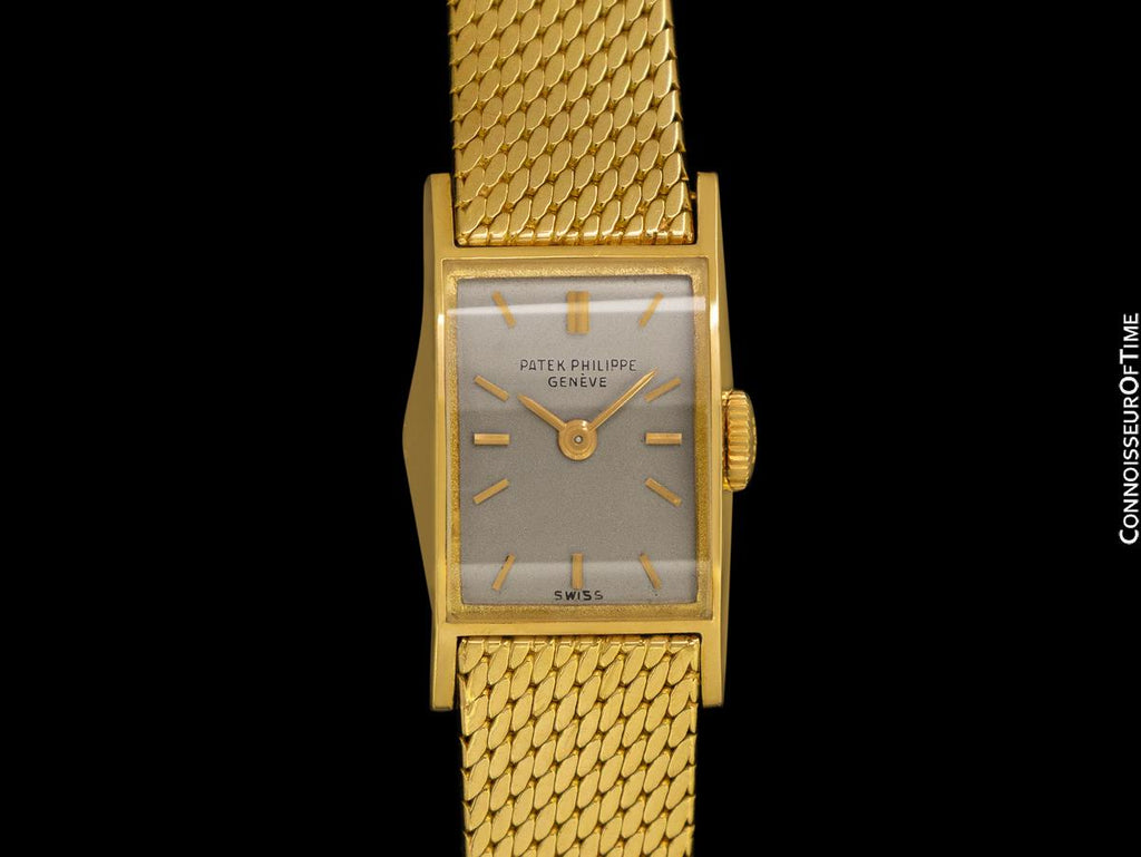 Band: Integrated 18K yellow gold mesh bracelet with signed Patek clasp, sized to fit a wrist up to approx. 6.3 inches on the larger of two size settings in the clasp, previously shortened, excellent condition. A jeweler could adjust the bracelet size.