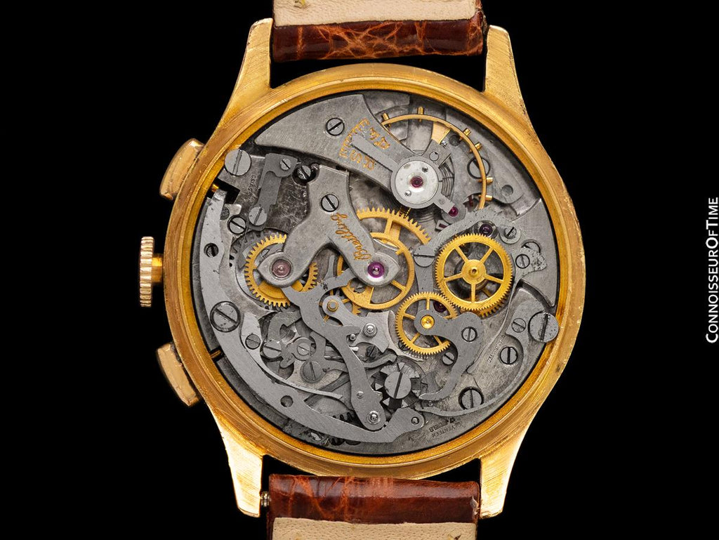 Serviced: One of our Master Watchmakers has fully serviced the watch which consists of fully disassembling the complex chronograph movement, carefully inspecting each part, installing a correct new mainspring, reassembling and lubricating the movement, and extensive timing testing and regulation (a $1295 value).