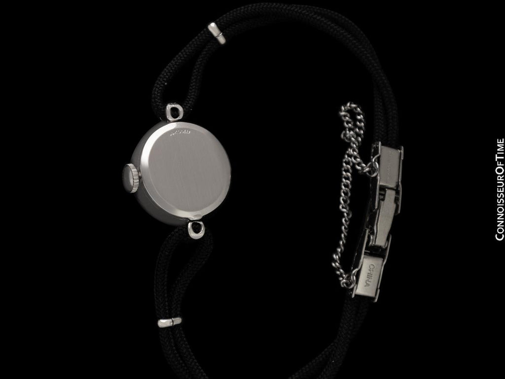 Its 14K white gold case is bejewelled with two full cut original factory set diamonds. They have the fire and brilliance you would expect from very high quality original Tiffany & Co. diamonds.
