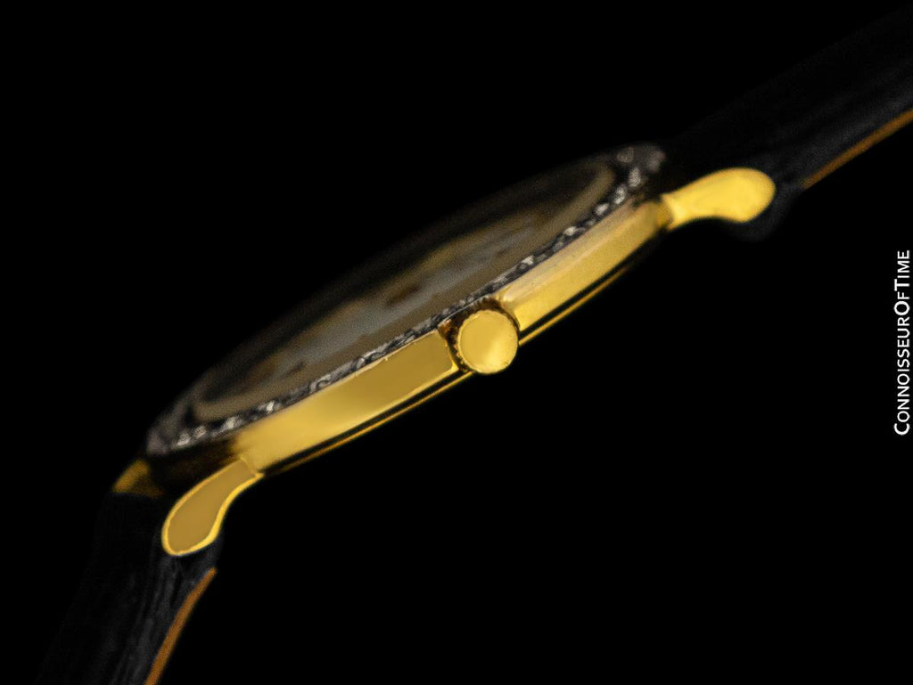 Its thin gold case and white dial, give it a fashionable and elegant vintage style. And its full diamond bezel really make a statement.