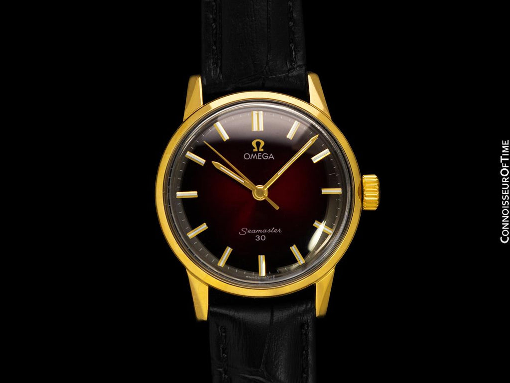Dial: Wine vignette - red wine in the center that fades to black around the periphery, gold baton indices, signed Omega Seamaster 30, expertly restored