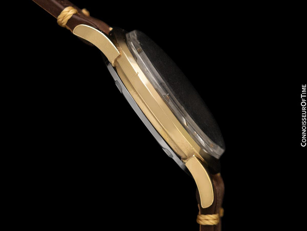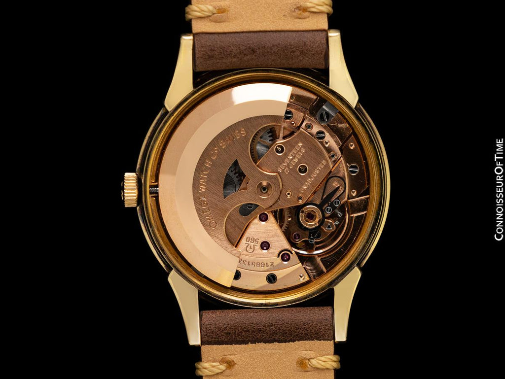 It is all original, and its case is just short of mint with only light wear and a few pin pricks. It fully retains all of its factory applied finish. Its gold-filled top with "tropical" steel back case has the look of a solid gold Omega without the price tag.