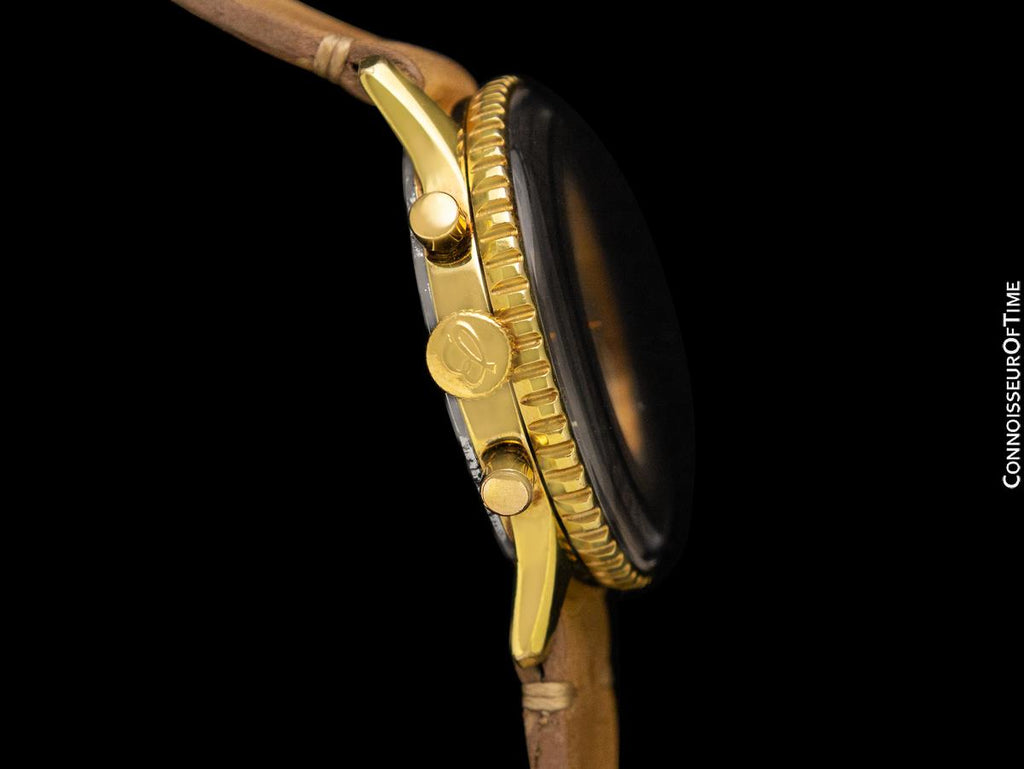 Its case is in pleasing and very honest condition, still retaining the imprint of its original factory satin finish on the back. The very tips of the lugs have the slightest bits of gold wear, but you need magnification to see it.