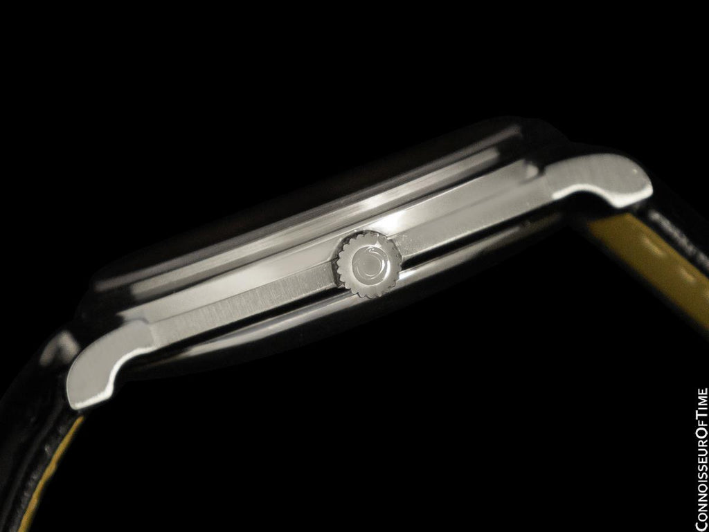 Band: Calfskin leather, fully stitched, unsigned, brand new and unworn with aftermarket Omega style buckle. We also stock lizard and a variety of other straps in various prints, skins, and colors. Please inquire if you would like a colored strap to swap or add as an extra to give you the option of changing the look whenever you like.
