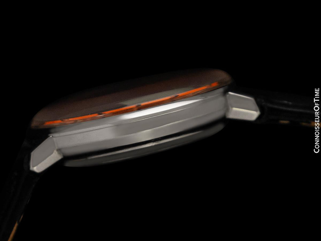 Dial: Original Omega dial signed Omega and custom refinished in an orange similar to Harley-Davidson color, blackened original steel baton indices, expertly custom refinished. The color is just slightly softer than the photos seem to suggest.
