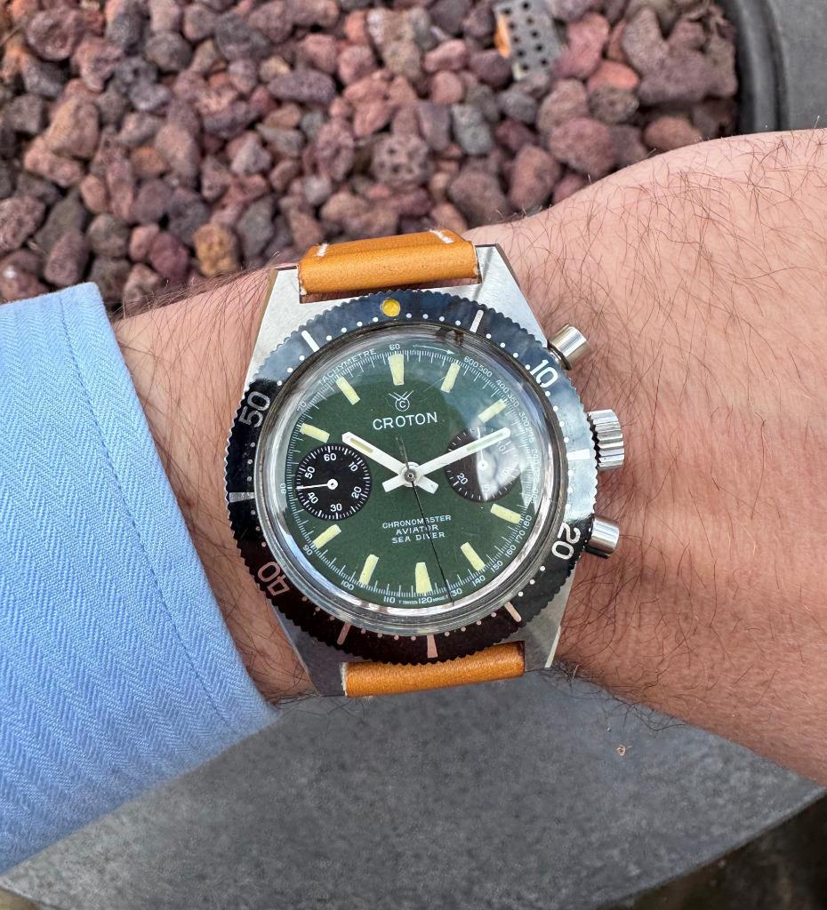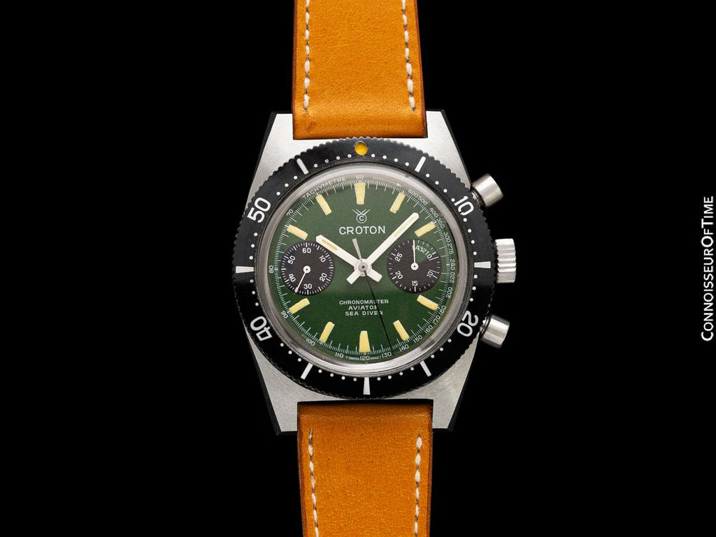 Today's offering showcases this exceptional new-old-stock example of one of Croton's sought after vintage Chronomaster Aviator Sea Diver chronographes. It is a very cool retro watch with exotic camo green dial from a brand that has become increasingly collectable.