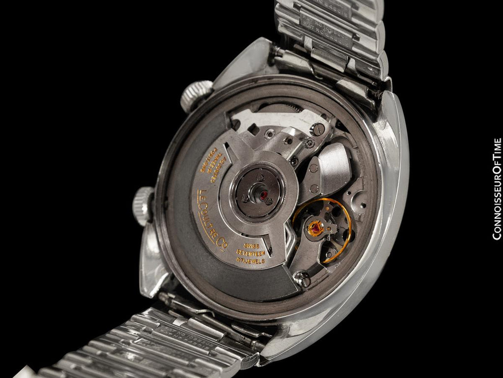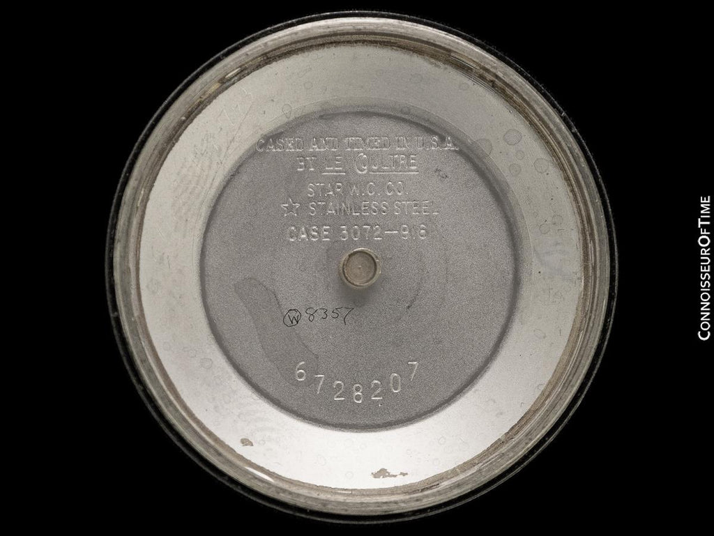 Band: Original, LeCoultre for this model, steel, interesting design with special patented links, clasp previously replaced with a period unsigned one, fits a wrist up to approx. a little under 7.5 inches on largest setting, adjustable, moderate stretch - finish is in excellent condition with fairly light wear. It has not been recently polished. Please inquire if you would like that done.