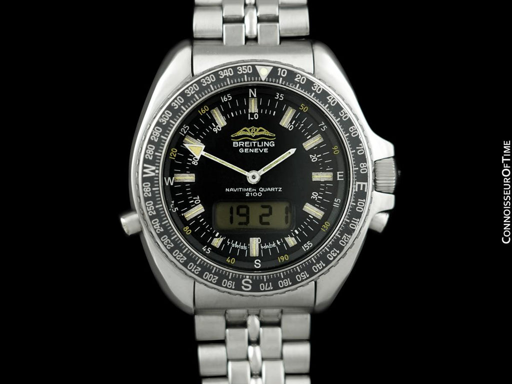 Designed with professional aviators in mind, it combines the iconic rotating bezel and flight-scale utility with the precision of a multifunction quartz chronograph. The black dial features luminous markers, analog hands, and digital display windows - a cutting-edge fusion for its time. Its stainless steel case and signed bracelet complete the look of a rugged pilot's tool that has become collectible today - a symbol of Breitling's survival through the quartz revolution and a fascinating chapter in aviation horology.