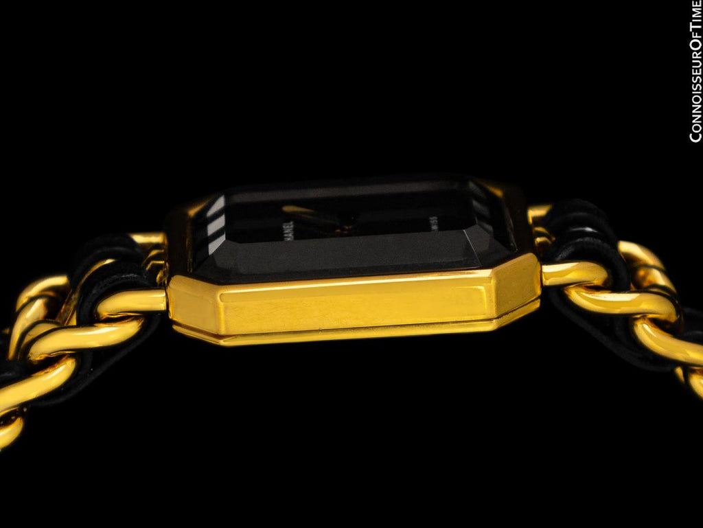 According to Chanel, "The Premiere...is worn like a piece of jewelry. Inspired by the codes of the house, this creation with distinctive lines evokes the stopper of the N°5 fragrance bottle. The supple chain bracelet interlaced with leather echoes the chain of classic Chanel handbags. The black-lacquer dial with golden hands and no numerals underlines the essential: A spirit of freedom and audacity unique to Chanel."